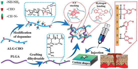 - Yan, S.; Wang, W.; Li, X.; Ren, J.; Yun, W.; Zhang, K.; Li, G.; Yin, J. Preparation of mussel-inspired injectable hydrogels based on dual-functionalized alginate with improved adhesive, self-healing, and mechanical properties. J. Mater. Chem. B 2018, 6, 6377–6390. [Google Scholar] [CrossRef]