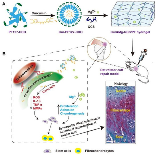 - Chen, B.; Liang, Y.; Zhang, J.; Bai, L.; Xu, M.; Han, Q.; Han, X.; Xiu, J.; Li, M.; Zhou, X.; et al. Synergistic enhancement of tendon-to-bone healing via anti-inflammatory and pro-differentiation effects caused by sustained release of Mg2+/curcumin from injectable self-healing hydrogels. Theranostics 2021, 11, 5911–5925. [Google Scholar] [CrossRef]