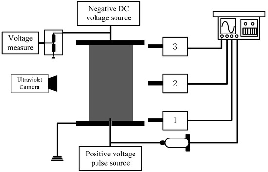 Figure 1 is a schematic diagram of the test equipment and measurement system used. Two flat electrodes and one needle electrode formed a three-electrode structure. The diameter of the parallel plates was 250 mm, and the distance between the upper and lower plates was 100 mm. The needle electrode was located at the circular hole (10 mm in diameter) in the center of the lower plates. The needle electrode was 2–3 mm above the plane of the lower plate, and was insulated from the lower plate. A negative DC voltage was applied to the upper plate, which was divided by a resistor divider, and then connected to a voltage measuring instrument via a coaxial cable. The lower plate was grounded. A square pulse voltage with adjustable amplitude and pulse width (1~6 kV, 100~250 ns) was applied to the needle electrode to trigger the positive polarity discharge. The square pulse voltage was divided by a high-voltage probe (Tektronix P6015A) that served as the trigger signal of a 4-channel 2 GHz oscilloscope (Agilent DSO7104A).