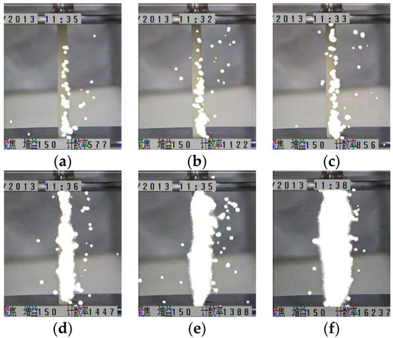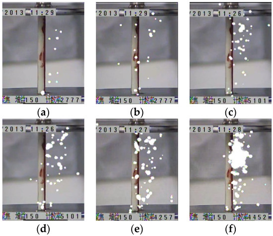 Streamer propagation photographs for the polymer with the silicone rubber coating. (a) 510 kV/m, (b) 540 kV/m, (c) 560 kV/m, (d) 590 kV/m, (e) 630 kV/m, (f) 660 kV/m.