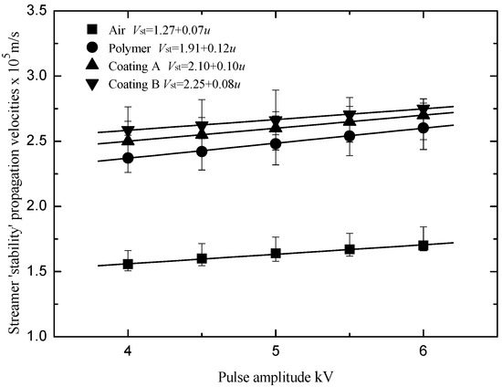 The propagation velocity of the streamers was calculated by the ratio of the vertical distance between the three photomultipliers and the time difference ΔT between the starting points of the rising edge of the light signals from the three photomultipliers (Figure 4). The streamer ‘stability’ propagation velocity Vst was defined as the streamer propagation velocity within the ‘stability’ electric field. Figure 7 shows the relationship between the streamer ‘stability’ propagation velocities and the pulse amplitude. The ‘stability’ velocities of the streamer propagation along the surface of the polymer with a coating were linearly related to the pulse amplitude. For Figure 7, Equation (3), which relates the streamer ‘stability’ propagation velocities to the pulse amplitude, was used to fit the curves. u is the pulse amplitude, kV; V0 is the streamer stable propagation velocity when the pulse amplitude is 0 kV, 105 m/s; β is the undetermined coefficient.