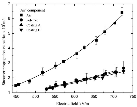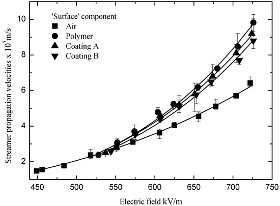 In Figure 8 and Figure 9, it can be seen that the velocities of the ‘surface’ components of the streamers were higher than those in the air alone, and they increased with the applied electric field significantly. In contrast, the velocities of the ‘air’ components of the streamers were lower than those in the air alone, and they increased with the applied electric field slowly. It can be explained that the electric field in the head of the ‘air’ component of a streamer is suppressed by the charge in the head of the ‘surface’ component. Furthermore, it can be seen that the velocities of the ‘surface’ components of the streamer decreased after the silicone rubber coating was applied to the polymer. In addition, the velocities of the ‘surface’ components of the streamers propagating along the different silicone rubber coatings were also different. However, the differences between the velocities of the ‘air’ components of the streamers propagating along the different insulation surfaces were relatively small.
