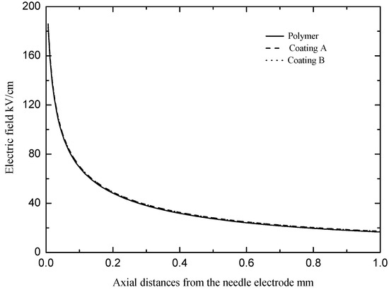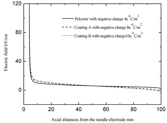 The main factors that affected the characteristics of the streamer propagation along the insulation surfaces were the permittivity and surface properties (the attachment of the charge to the surface, photoemission of secondary electrons from the surface, etc.) [18]. First, the influence of the silicone rubber coating on the permittivity of the polymer sheet was analyzed. Figure 10 shows the variation of the electric field from the needle electrode up to 1 mm along the insulation surface. The thickness of the silicone rubber coating was considered to be 0.5 mm. It can be seen that the electric fields from the needle electrode up to 1 mm along both the polymer and the polymer with the silicone rubber coating were basically the same, but the electric field along the polymer with the silicone rubber coating was slightly strengthened. The permittivity of the silicone rubber coating was smaller than that of the polymer. After the silicone rubber coating was applied to the polymer, the volume of the polymer sheet with the silicone rubber coating became larger than that of the polymer sheet. The overall capacitance (permittivity) increased, so the electric field along the polymer sheet with the silicone rubber coating increased. However, the silicone rubber coating only had a small increase in the electric field at the tip of the needle electrode, which indicates that the silicone rubber coating produced a small change in the overall permittivity (capacitance) of the polymer sheet. Therefore, the change in the overall permittivity caused by the silicone rubber coating had a tiny impact on the electric field distribution in the gap.