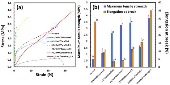 Tensile properties of coating materials: (a) Stress–strain curve and (b) maximum tensile strength and elongation at break (n = 5). The control indicates the starch/glycerol blend. Means with different lowercase letters of elongation at break and the uppercase letters of maximum tensile strength were significantly different (p < 0.05).