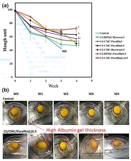 Quality of the coated and uncoated eggs: (a) Variation in Haugh units (HUs) (n = 5) of cassava starch (CS) blended with hydroxypropyl methylcellulose (HPMC), carboxymethyl cellulose (CMC), beeswax, paraffin, and low-molecular-weight paraffin wax (Paraffin(L)) during storage from day 0 to week 4 at 25 ± 3 °C and 65 ± 2% relative humidity. The control indicates uncoated eggs. ND indicates not detected. Means with different lowercase superscript letters were significantly different (p < 0.05). (b) Images of uncoated eggs (control) and eggs coated with CS/CMC/Paraffin(L)0.5 from day 0 to week 4.