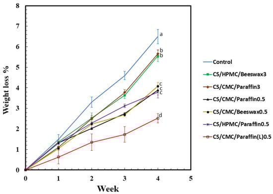 Variation in weight loss (%; n = 5) of eggs coated with cassava starch (CS) blended with hydroxypropyl methylcellulose (HPMC), carboxymethyl cellulose (CMC), beeswax, paraffin, and low-molecular-weight paraffin wax (Paraffin(L)) during 4 weeks of storage at 25 ± 3 °C and 65 ± 2% relative humidity. The control indicates uncoated eggs. Means with different lowercase superscript letters were significantly different (p < 0.05).