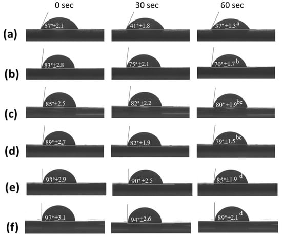 Water contact angles (n = 5) of (a) CS/HPMC/Beeswax3, (b) CS/CMC/Paraffin3, (c) CS/CMC/Paraffin0.5, (d) CS/CMC/Beeswax0.5, (e) CS/HPMC/Paraffin0.5, and (f) CS/CMC/Paraffin(L)0.5. Means with different lowercase superscript letters were significantly different (p < 0.05).