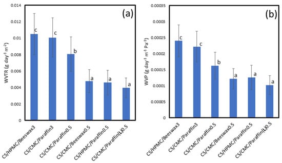 Water-resistance properties of coating materials: (a) water vapor transmission rate (WVTR) and (b) water vapor permeability (WVP) (n = 5). Means with different lowercase superscript letters were significantly different (p < 0.05).