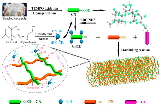 Firstly, we should re-examine our previous experiments. In this study, CN and CD were two additional elements, as shown in Figure 1. CNCD was first prepared by covalent bonding between CN and CD. Secondly, CNCD was combined with CS. Lastly, crosslinking took place in CS chains for constructing CS/CNCD composite hydrogel.