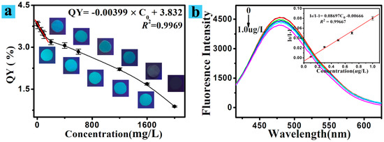 (a) Fluorescence change and QY of the CS/CNCD composite hydrogel mixed with different Cr(VI) concentrations; (b) fluorescent spectra of the CS/CNCD composite hydrogel mixed with lower Cr(VI) concentration, and the relationship between I0/I − 1 and concentration.