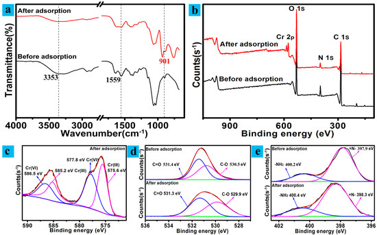(a) FTIR spectra; (b) XPS total survey scan; (c–e) XPS spectra associated with Cr2p, O1s, and N1s.