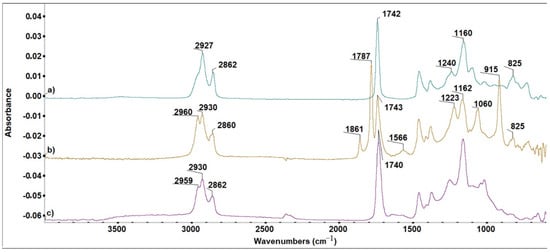 For our discussion, the FTIR spectrum of ELO (Figure 1a) shows a typical absorption at 825 cm−1 attributed to the stretching vibration of epoxy rings. The (b) spectrum (Figure 1b) corresponds to the unreacted mixture ELO-HY-DY-THA, with the expected characteristic bands: 825 cm−1 (typical for the epoxy ring), 915 cm−1 (δC–H, oop aromatic folding), 1060 cm−1 (δC–O, HY 964 anhydride), 1223 cm−1 (δC–N, DY 064), 1566 cm−1 (δC=C), 1787 and 1861 cm−1 (δC=O, anhydride). In the (c) spectrum (Figure 1c) of the cured material, the absorption band of the epoxy rings (825 cm−1) and those of the other reactants (1060, 1223, 1566, 1787, and 1861 cm−1) disappeared, as expected after crosslinking and photopolymerization of ELO. The new bands in the range 1000–1100 cm−1 can be ascribed to the new C–O bonds formed during the two curing processes.
