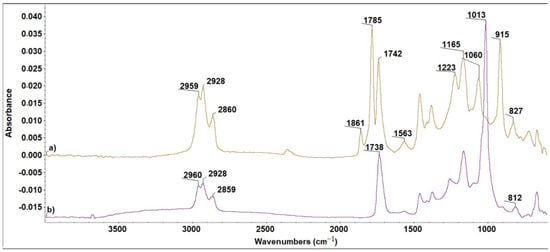 FTIR spectra of the S1 system (ELO + 5%LnK). (a) Before and (b) after dual-curing reaction.