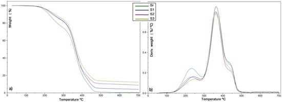 All ELO and ELO-LnK composites show in inert atmosphere a similar behavior, indicating a comparable thermal stability. When LnK is loaded, a lower degradation rate was noticed for all samples (S1–S3) as compared to the reference sample Sr, indicating an improved thermal stability associated with the aromatic structure of the filler. For the S2 system, a slight decrease of Td values in the entire temperature range was observed. Such behavior could be explained by a poor LnK dispersion within ELO-based matrix, as a result of an inefficient homogenization. As can be seen from the weight loss curves, above 300 °C, the reference material (Sr) decomposes faster leading to lower residual char at 700 °C (1%), due to the complete decomposition of the LO aliphatic chains. The remaining char quantity is due, probably, to the THA initiator and DY064 accelerator aromatic structures. The increase of residual mass at 700 °C for the S1–S3 composites could be explained by the crosslinked phenolic-type structure of LnK, which does not easily break down [].