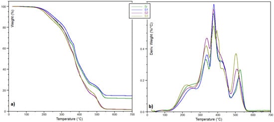 All DTG curves showed a three-step decomposition behavior (Figure 3b). The weight loss onset, up to 300 °C (representing ~20% of sample weight) could be attributed to the volatilization of decomposition products with low molecular weight and low boiling point. The next mass loss stage (of ~65%), with the maximum rate around 365 °C could be attributed to the decomposition of polymeric and oligomeric fragments, whereas the last weight loss (of ~15%), transposed in the DTG curves as a shoulder around 450 °C, probably corresponds to C–C bond cleavage [].