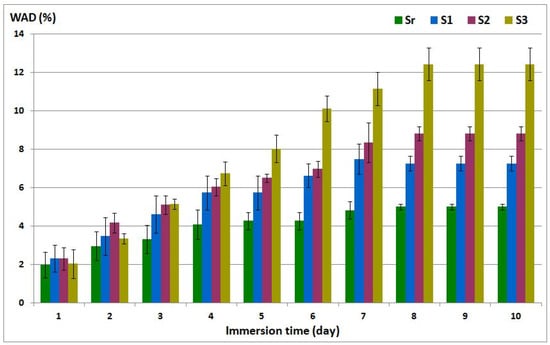Static water contact angle measurements (CA) and water absorption experiments (WAD) were carried out to evaluate the wettability of the composites. The results are shown in Table 2 and Figure 6, respectively.