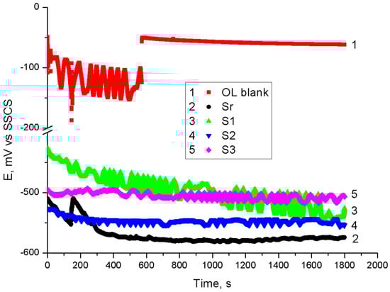 The anticorrosion performance of ELO-LnK composites was evaluated using coated carbon steel sheets. Figure 7 shows the open circuit potential (OCP) curves vs. time obtained for samples coated with ELO-LnK (Sr, S1, S2, S3) in 3.5% NaCl solution. In the absence of LnK, the initial potential is shifted towards more negative values (curve 2), showing for a short time a shift towards more positive values, maybe due to the porosity of the coating and formation of an oxide film. OCP stabilized gradually with prolonged immersion time up to 600 s. The addition of the LnK leads to a shift of the potential in open circuit towards more positive values. The samples with higher LnK content (S2 and S3–curves 4 and 5) reach a stable potential value shortly after immersion (in about 200 s), while S1 (curve 3) shows a higher potential instability, which might be related to a higher porosity.