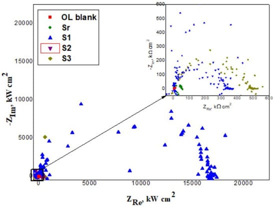 The Nyquist recorded spectra (Figure 9), show a semicircle, the higher diameter being associated with the S1 sample (5% LnK). These results are in good agreement with those obtained from Tafel measurements.