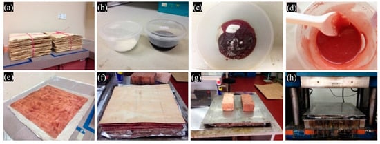 Fabrication of seven-ply rubberwood LVL; (a) veneer size: 400 × 400 × 2 mm (b) ratio of PF to filler is 3:1; (c) PF and filler were mixed thoroughly; (d) ready-use resin; (e) resin application on the veneer; (f) LVL lay-up with veneer tight side facing tight side and loose side facing loose side; (g) cold pressing for five minutes; and (h) hot pressing for twelve minutes.