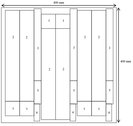 Cutting pattern of specimens for physical and mechanical tests. Note: (1) physical tests such as density, specific gravity, water absorption, radial swelling, longitudinal swelling, tangential swelling and volumetric swelling after two and 24 h; (2) static bending; (3) tensile parallel to the longitudinal axis; (4) compression parallel to the longitudinal axis; (5) gluebond shear test.