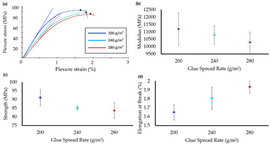 Mechanical characterization of LVL samples made with different glue spread rates by flatwise direction bending tests: (a) representative stress-strain curves for each treatment; (b) elastic modulus; (c) strength; (d) elongation at break.