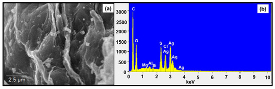 (a) SEM micrograph of Ag NPs@GO-FL-CS 100 and (b) the EDX analysis spectrum.