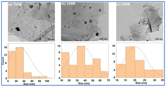 TEM images of (a) the Ag NPs@GO-FL-CS 100, (b) Ag NPs@GO-FL-CS 200, and (c) Ag NPs@GO-FL-CS 300 composites and the corresponding Ag particle size distribution histograms.