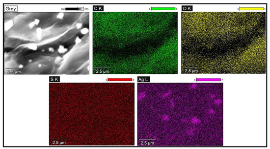The TEM analysis displayed the nanoparticles distributed on the surface of the GO-FL-CS matrix. The size distribution of these particles ranged from 20 to 60 nm. The Ag NP-decorated GO-FL-CS membranes that were developed using silver nitrate solutions of 100, 200, and 300 mg/L revealed Ag crystallites with average sizes of 30.0, 35.5, and 20.3 nm, respectively (Figure 3). The increase in concentration of silver ions to 300 mg/L led to the decrement of particle size. This effect is ascribed to the limited number of surface amino groups available for the silver-reduction process [30]. A relatively lower metal precursor concentration (200 mg/L), on the other hand, resulted in broad grain size distribution. This is presumably due to the increased disorder at the interface of the GO-FL-CS adsorbent/Ag+ solution [31]. STEM elemental mapping was executed to assess the distribution of these particles on the surface of the GO-FL-CS adsorbent. Figure 4 shows a uniform dispersion of C (green), O (yellow), and S (red) throughout the membrane surface after adsorption. The STEM as well as TEM analysis illustrated that the Ag NPs were randomly spread throughout the adsorbent matrix.