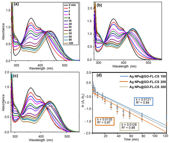 A comparative study of the 2,4-DNP reduction kinetics of Ag NPs@GO-FL-CS was performed (Figure 7a–d). The apparent reduction rates were found to be (1.21 × 10−2) ± (4.39 × 10−4), (1.35 × 10−2) ± (4.57 × 10−4), and (1.28 × 10−2) ± (2.01 × 10−4) min−1 for a solution in contact with Ag NPs@GO-FL-CS 100, Ag NPs@GO-FL-CS 200, and Ag NPs@GO-FL-CS 300, respectively. This shows that Ag NPs@GO-FL-CS 200 performed relatively better. The results obtained in this experiment are in agreement with the EDX and ICP-MS data that showed a higher Ag loading for Ag NPs@GO-FL-CS 200. Nevertheless, this composite exhibited Ag NPs with larger sizes (10–70 nm) than Ag NPs@GO-FL-CS 300 (10–35 nm). Consequently, the increasing reduction rate of Ag NPs@GO-FL-CS 200 could also be attributed to the presence of a significant number of grains that were larger than 50 nm. These have been reported to display a higher number of active sites at the vicinity of the particle boundaries [44]. Considering the results obtained by ICP-MS analysis and the reduction kinetics of Ag NPs@GO-FL-CS, the optimised concentration of Ag at the surface of GO-FL-CS was 16.95 wt%.