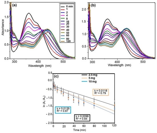 UV-Vis absorption spectra for the reduction of 2,4-DNP over Ag NPs@GO-FL-CS 200 using (a) 5 mg and (b) 10 mg; (c) The corresponding kinetics graphs.