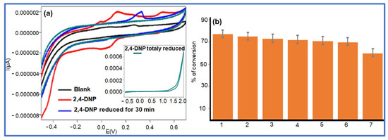 (a) Cyclic voltammetry curves obtained with solutions of 2,4-DNP before and after treatment with Ag NPs@GO-FL-CS; (b) Reusability test.