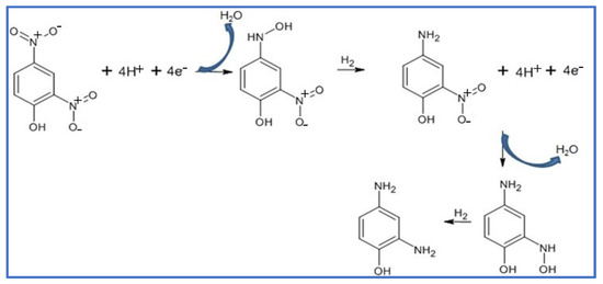 Freshwater ecosystems represent only 3% of the earth’s surface water and is distributed throughout rivers, lakes, and dams [1,2]. These are considered to be the main sources of clean water for humans and wildlife. However, the fast-growing population, increased agricultural activity and expanding chemical industry have put a strain on the quality of this ecosystem. The contamination of freshwater bodies has seen a notable rise throughout the past two decades due to technological innovations and industrialisation. The pace of industrialisation has proceeded far beyond the capability of regulators to implement meaningful restrictions on the level of point source pollution that is acceptable to the various industrial complexes [3]. The discharge of industrial wastewater into the environment has caused severe damage to the quality of the freshwater ecosystem. Treatment of these effluents represents one of the feasible approaches that can reduce the contamination of bodies of water. Amongst various pollutants identified in wastewater, nitroaromatics have been described as exhibiting acute toxicity to aquatic organisms and human health. These compounds are very stable in an aqueous environment and have demonstrated estrogenicity and mutagenicity [4]. This characteristic property is ascribed to the –NO2 group interacting with the reductase enzymes and generating the reactive oxygen species [5]. Interestingly, this group can also undergo hydrogenation in proton and electron donors to yield the less toxic aminoaromatics.