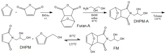 - Liu, X.; Du, P.; Liu, L.; Zheng, Z.; Wang, X.; Joncheray, T.; Zhang, Y. Kinetic study of Diels–Alder reaction involving in maleimide–furan compounds and linear polyurethane. Polym. Bull. 2013, 70, 2319–2335. [Google Scholar] [CrossRef]