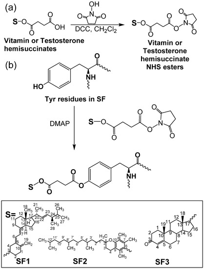 Synthetic route to vitamins–SF and testosterone–SF. (a) Formation of N-hydroxysuccinimide derivatives of vitamin and testosterone hemisuccinate; (b) reaction of tyrosine moieties in SF with vitamin and testosterone N-hydroxysuccinimide derivatives.