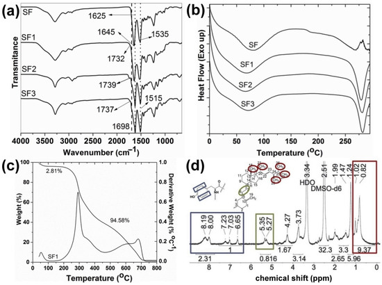 (a) IR spectra of native and modified SF; (b) DSC curves of SF and SF1–SF3 conjugates; (c) TGA thermogram of SF1 with weight loss indicated; (d) 1H NMR spectrum of SF1 in DMSO-d6 (see structures in Figure 1).