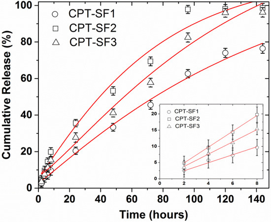 CPT delivery of CPT-loaded SF aggregates in PBS, 37 °C, adjusted to a SWeibull2 function; CPT releases for initial 8 h, adjusted to a linear function (inset) (see structures in Figure 1). Mean ± standard deviation (n = 3).
