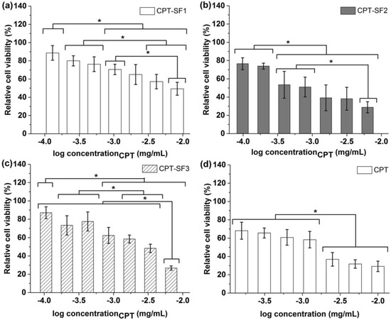 Relative viability of MCF-7 cells with (a) CPT-SF1 aggregates; (b) CPT-SF2 aggregates; (c) CPT-SF3 aggregates and (d) parent CPT (see structures in Figure 1). Mean ± standard deviation (n = 3). * represent means with significant differences (p < 0.05).