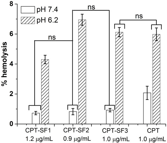 Percentage of hemolysis of RBC treated with CPT-loaded SF nanoaggregates and parent CPT in PBS at pH 7.4 and 6.2 (see structures in Figure 1). Mean ± standard deviation (n = 3). ns represent means with no significant differences (p > 0.05), but significant differences exist between non-marked bars (p < 0.05).