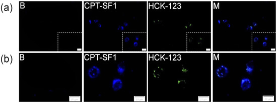 (a) MCF-7 cells fluorescence images and amplified area (b) of cells with LysoTracker (B), cells with 0.1 mg/mL of CPT–SF1, 50 nM of LysoTracker Yellow HCK-123 and combined pictures (M), scale bars are 20 µm (see structures in Figure 1).