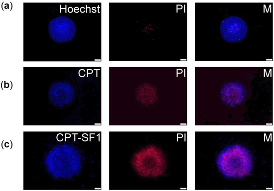 (a) MCF-7 spheroid fluorescence images without particles and PI or Hoechst staining. (b) Spheroids with 0.1 mg/mL of CPT, PI, and combined pictures (M); (c) Spheroids with 0.1 mg/mL of CPT–SF1, PI, and combined pictures (M). Scale bars are 100 µm (see structures in Figure 1).