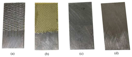 Prepared specimens: (a) GFRP/steel, (b) KFRP/steel, (c) epoxy/steel, (d) non-coated steel.