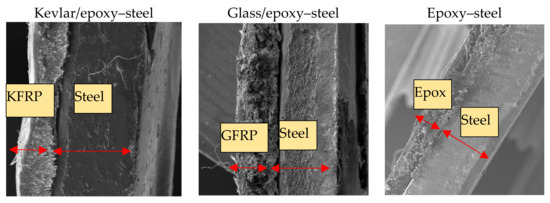 Four types of specimens were prepared using the hand layup process, as shown in Figure 1. The first type is a control sample, a non-coated steel specimen referred to as the exposed substrate. The second type is the epoxy-coated steel specimen, referred to as epoxy/steel. The third and fourth types are the glass fiber-reinforced polymer and Kevlar fiber-reinforced polymer layers added to the steel specimens, referred to as GFRP/steel and KFRP/steel, respectively. The glass fabric (grade GF-22-280-100) and Kevlar fabric (grade K-22-300-100) are (0°/90°) woven fabrics manufactured by Easy Composites Ltd. The polymeric matrix comprises 100 parts epoxy resin (EL2) and 30 parts curing agent (AT30). The prepared specimens were left for 48 h at room temperature to cure. The average thickness of the epoxy coating and FRP composite layers in all the specimens was 0.5 mm for each layer. Figure 2 shows the SEM images of the cross-sections of the prepared specimens.