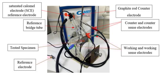 Potentiodynamic polarization testing was used to evaluate the kinetics of the corrosion reactions and the corrosion rates and potentials concerning the anodic reactions, the cathodic reactions, and passivity [43]. The potentiodynamic polarization scans were from −1.2 V to 0.5 V (SCE). In addition, EIS was used to quantify the impedance of coatings to corrosion and to evaluate the interfacial interactions of the coated systems from the solution interface, across the coating, and near the steel substrate, according to the ASTM-G106 standard [44]. The four specimens were immersed in 0.5 M NaCl, 0.5 M HCl, and 0.5 M H2SO4 solutions to study their behavior. An EIS study was carried out at open circuit potentials (OCPs) within the frequency range of 0.2 Hz to 100,000 Hz. OCP tests were carried out to evaluate the dominance of the anodic reactions versus the cathodic reactions and their variations with time concerning the coating type system and the environmental conditions. The electrochemical tests were carried out with the GAMRY 3000 potentiostat, as shown in Figure 3.