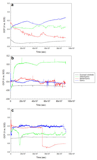Open-circuit potentials in (a) 0.5 M NaCl, (b) 0.5 M HCl, and (c) 0.5 M H2SO4 solutions for the exposed substrate and glass/epoxy, Kevlar/epoxy, and epoxy systems.