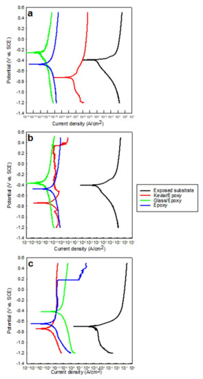 Potentiodynamic polarization in (a) 0.5 M NaCl, (b) 0.5 M HCl, and (c) 0.5 M H2SO4 solutions for the exposed substrate and glass/epoxy, Kevlar/epoxy, and epoxy systems.