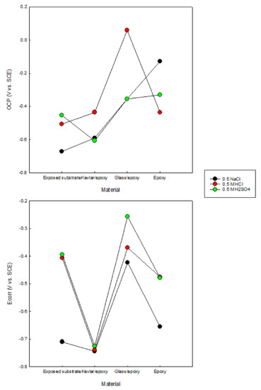 Open-circuit and corrosion potentials in 0.5 M NaCl, 0.5 M HCl, and 0.5 M H2SO4 solutions for the exposed substrate and glass/epoxy, Kevlar/epoxy, and epoxy systems.