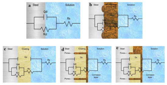 Electrochemical equivalent electric circuit models obtained from fitting the impedance data: (a) bare steel before corrosion, (b) corroded bare steel, (c) coated steel, (d) enhanced corrosion resistance, and (e) decreased corrosion resistance.