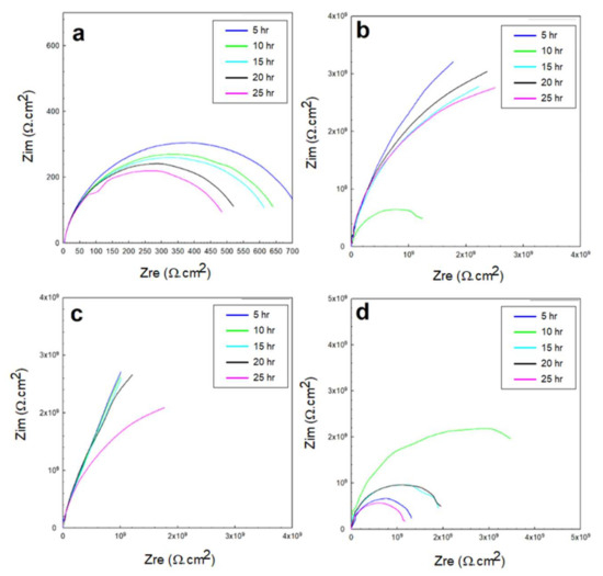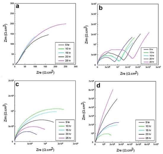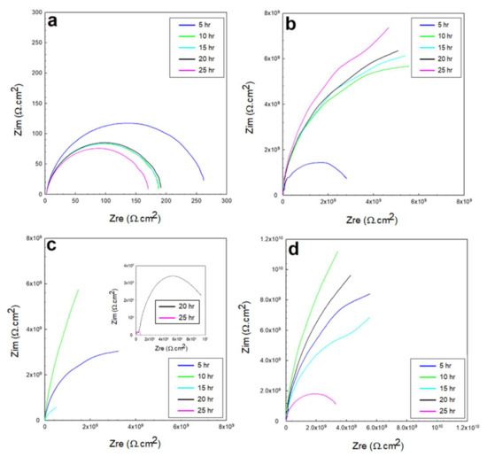 EIS Nyquist plots of the 0.5 M H2SO4 solution for: (a) exposed steel, (b) glass/epoxy, (c) Kevlar/epoxy, and (d) epoxy systems.