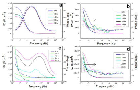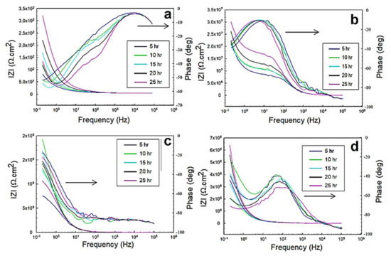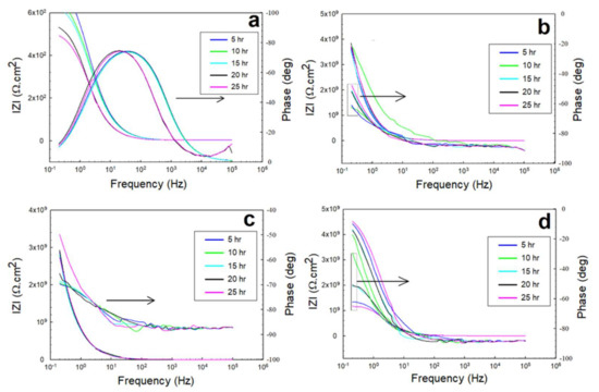 EIS Bode plots of the 0.5 M H2SO4 solution for: (a) exposed steel, (b) glass/epoxy, (c) Kevlar/epoxy, and (d) epoxy systems.