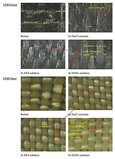 Figure 14 presents optical microscope images of the tested samples before and after testing, and the failure mode of each specimen is described. The glass/epoxy system showed a high stability against corrosion in all solutions without signs of deterioration, pores, or significant localized disbandment or scratches through which sustained corrosion or mass transport could occur. Expectedly, the NaCl solution sample retained salt crystals. There was no evidence that chloride was involved in the localized corrosion—otherwise, iron chloride products would have intermixed with iron oxides. In the acidic HCl and H2SO4 solutions, slight localized changes in color were observed on the fibers. Kevlar samples showed deterioration in epoxy, and the appearance of pores and the color change was mostly in the H2SO4 solution. The epoxy-only system showed evidence of minor pores acting as diffusion channels, but it showed stability regardless of the environmental conditions. Comparably, the steel samples were heavily attacked, most severely in the acidic solutions.